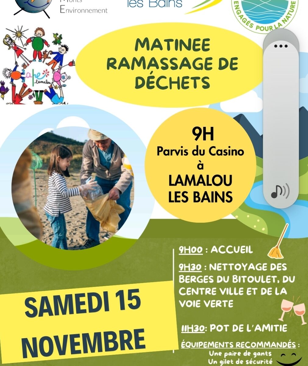 Ramassage de déchets sauvage le samedi 15 novembre le matin de 9h00 à 12h00 organisé par Eva et l’Association des Parents d’élèves de Lamalou les Bains, soutenu par le COME. La mairie de Lamalou ,partenaire du projet, offrira un pot de l’amitié pour clôturer l’évènement.